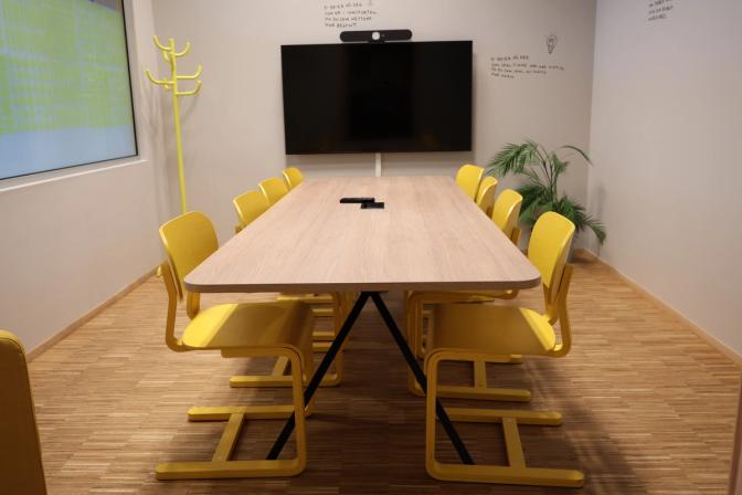 Gruppe-/møterommet "hybelen" har sitteplass til åtte personer – ti personer hvis dere henter noen stoler utenfra. Rommet er utstyrt med storskjerm og mulighet for å koble opp til teams-møter. Husk å ta med egen laptop.